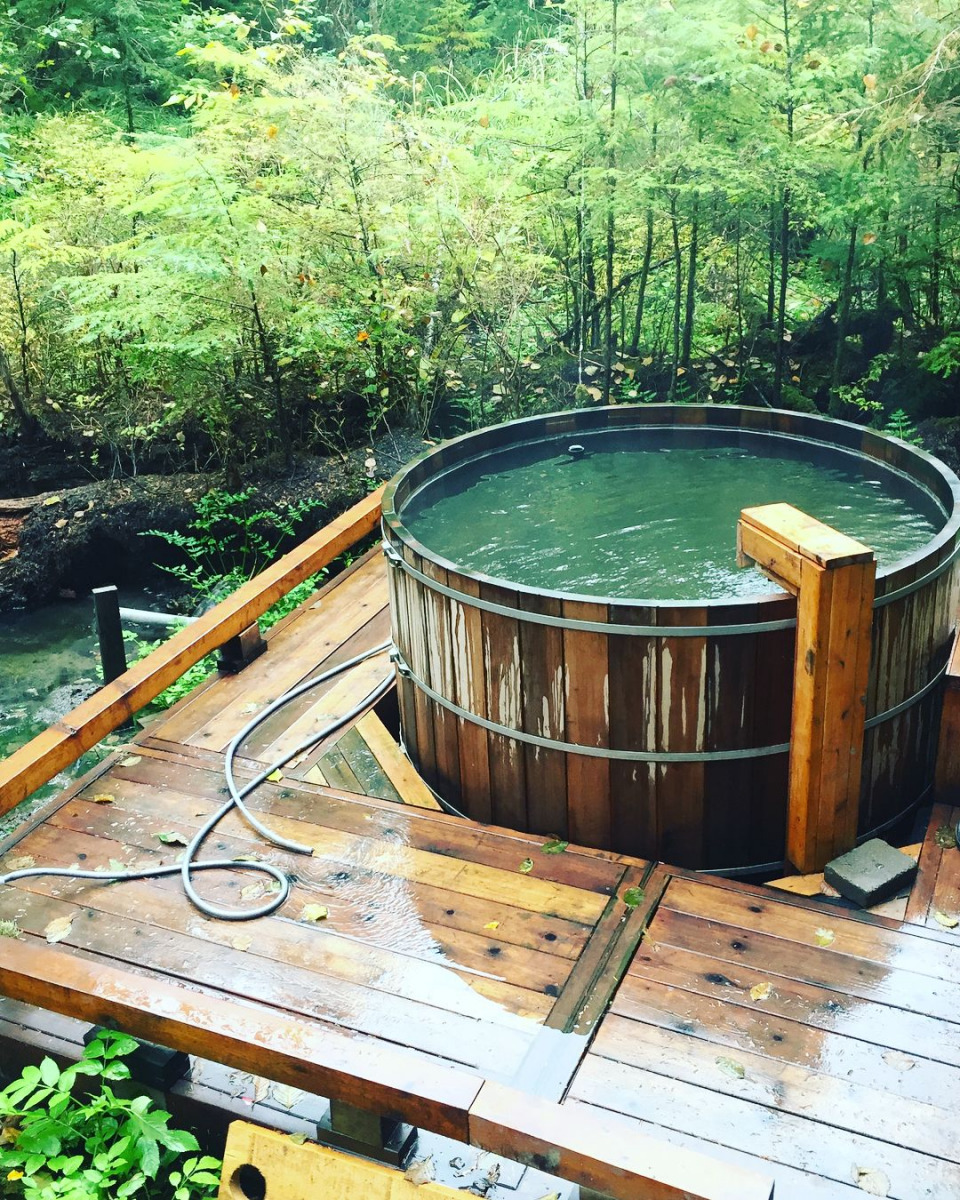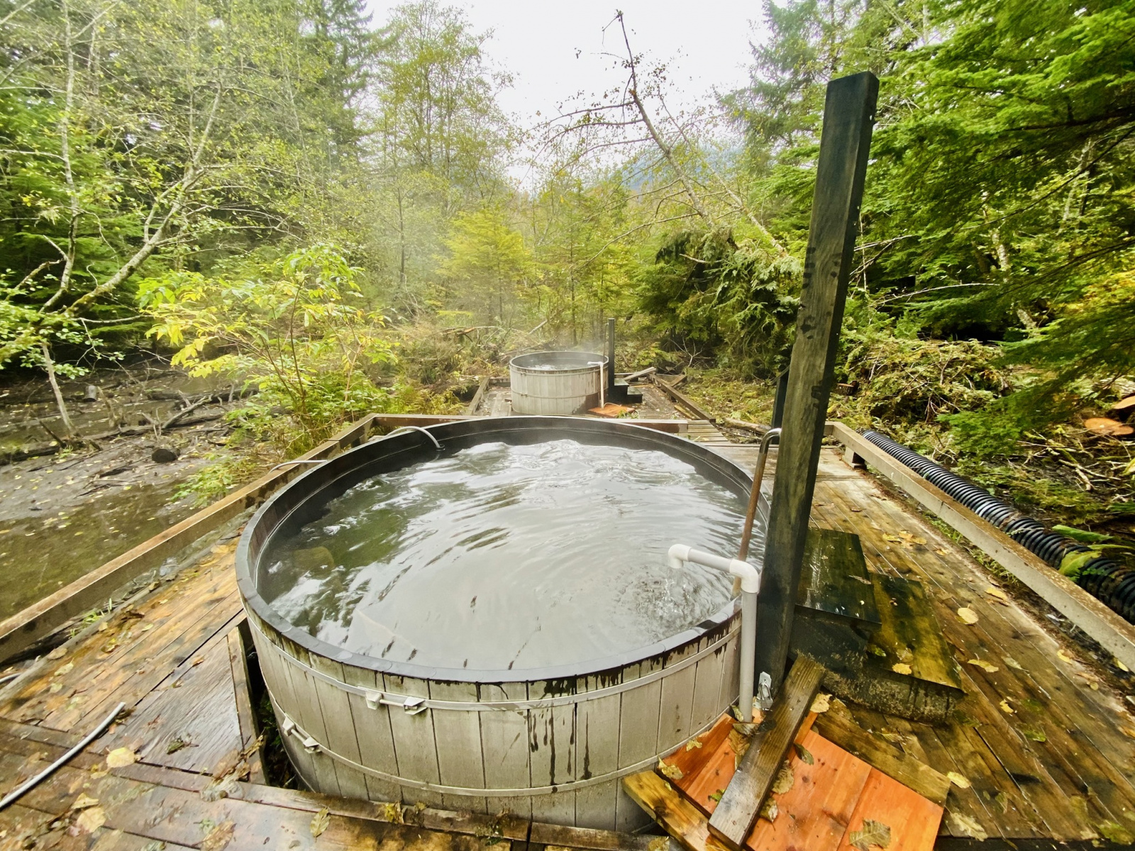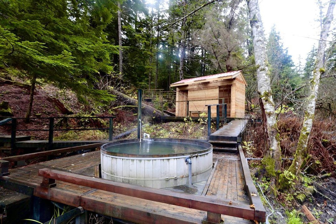 On the south side of the highway, about 500 metres east of Ksi Ansit’aagan (Ansedagen Creek) is the parking lot for Aiyansh Hot Springs. The route has been refurbished with ramps to make it easier to access, as well as extra changing rooms. About 50 metres from the trailhead, there is a rest spot. The strong sulphur odour in the water could make people uncomfortable. There’s plenty of chilly water to mix with, but the vents are between 55 and 58 degrees Celsius (toasty).