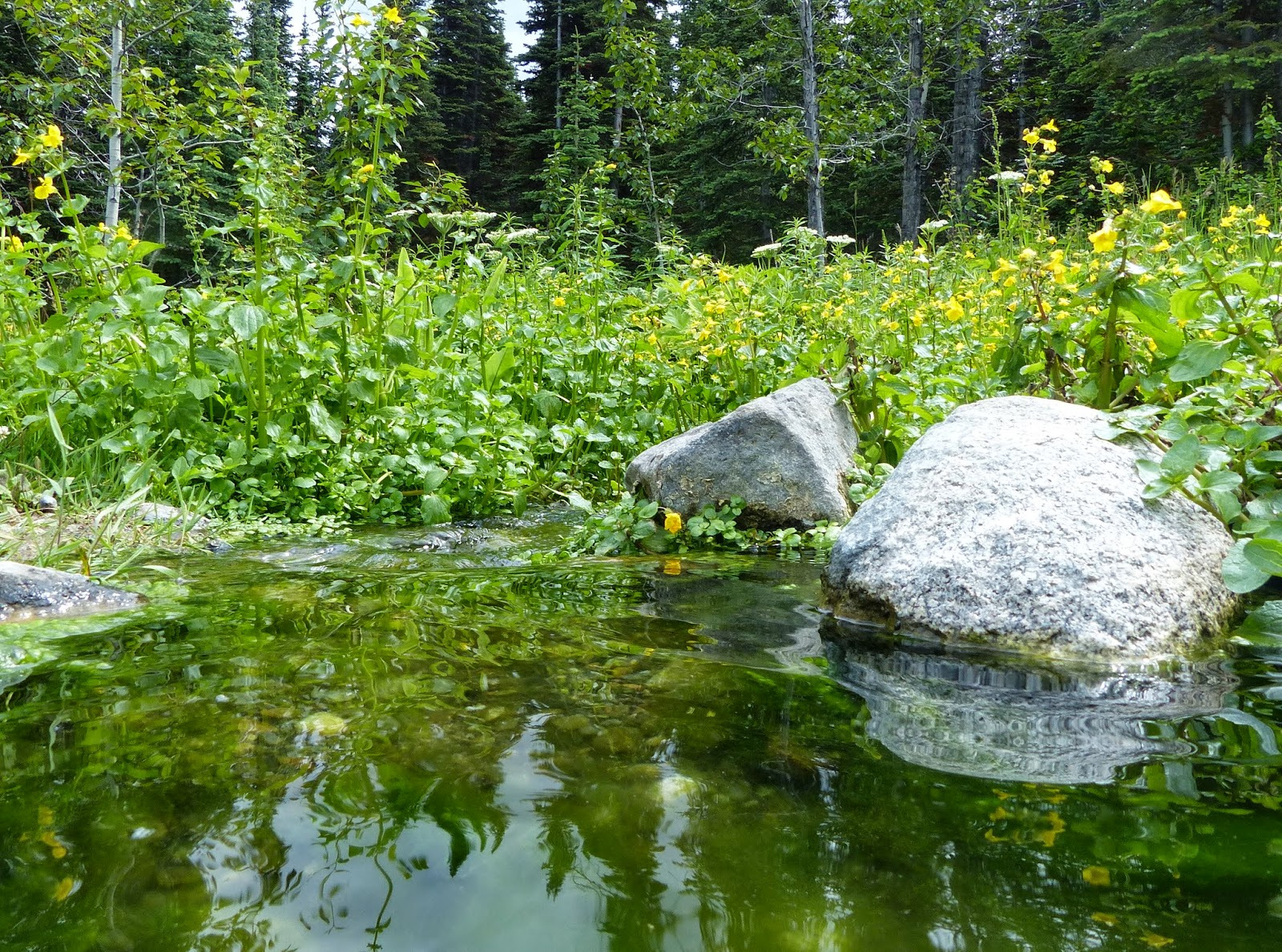 The warm springs near Atlin is a popular place for locals and Yukoners alike. Found near the end of Warm Bay Road, this pool is still quite natural and continuously fed by warm water from the ground. A stream captures the overflow, which works its way through the meadow and surrounding forest to Atlin Lake at Warm Bay.