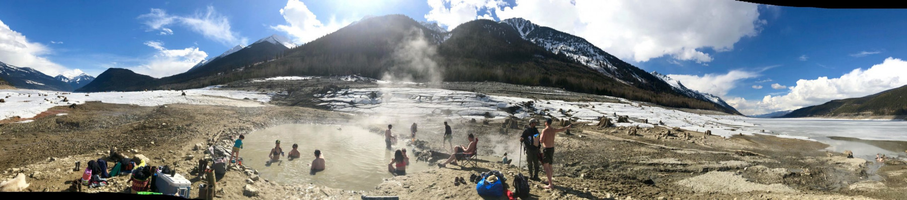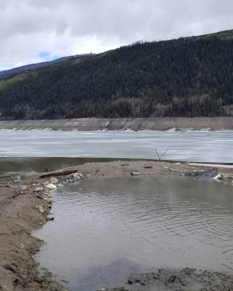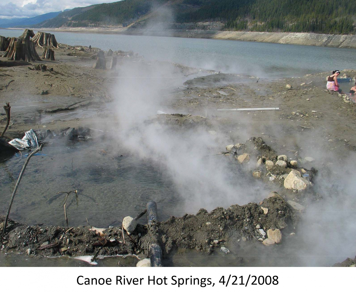 After 1973, access to the hot springs was limited to when the reservoir level was low enough to expose the spring. Visitors can drive to the springs from the west side of the valley, which is only a short beach walk away. The cedar tubs are now gone, and each time the water level changes, a new soaking pool is dug in the rocks and muddy beach. The experience has also evolved. Bathers are surrounded by an enormous view of mountains and a stony beach dotted with the stumps of old cedars, rather than a thick cedar forest and mosquito infestation. It’s a murky sulfur-scented soak that changes every time the water level ebbs and flows.