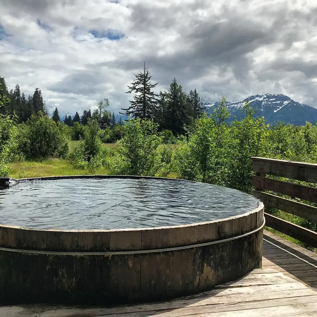 Don’t expect seclusion at these Forest Service-owned hot springs, despite their location 28 miles upstream. It’s a popular hangout for locals, who may pack the place on weekends and holidays. One protected tub and one open to the weather, as well as dressing rooms, benches, and outhouses. Access is through a short trail off Hot Springs Slough. Chief Shakes Hot Springs is a free day-use facility in Southeast Alaska that has become a popular destination for visitors and locals alike. You can soak within the screened porch or outside in the fresh Alaskan air in the second 7′ diameter redwood hot tub, which is just feet away.