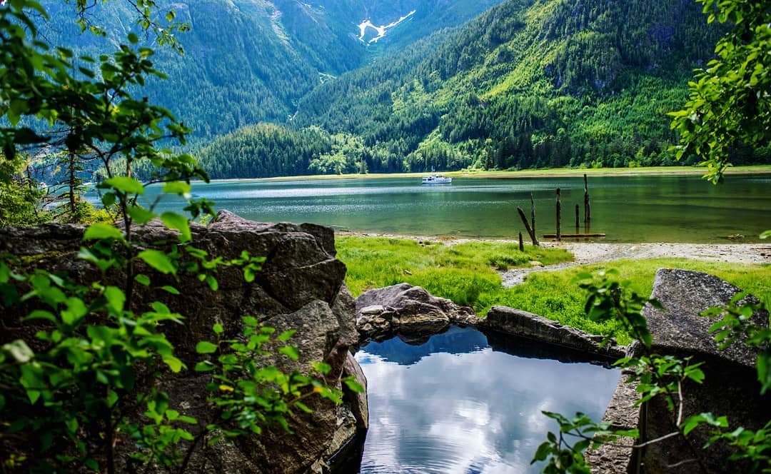 One of the largest and most popular springs on the coast, the Eucott Bay Hot Springs offers good anchorage for Watercraft. The odorless springs have been enveloped by natural boulders and concrete slabs placed by locals working at the former mill site at Ocean Falls. The Eucott Bay Hot Springs, Like Nearby Nascall Hot Springs, reach a temperature of 44°C (111°F). While soaking in the pools, you can spot whales in the Dean Channel or hear the howl of a Central Coast grey wolf in the evening.