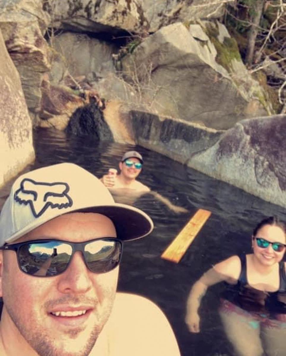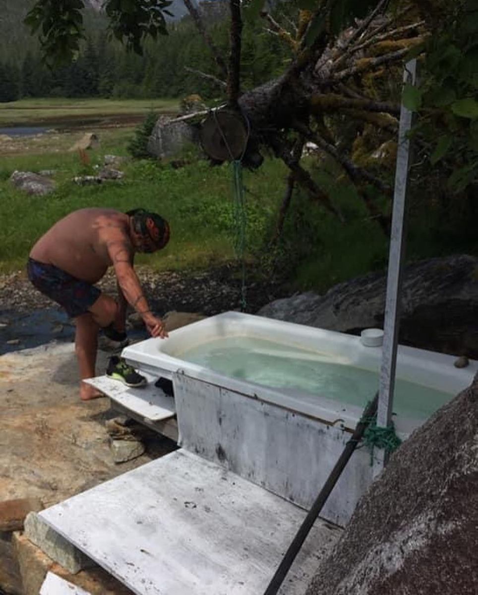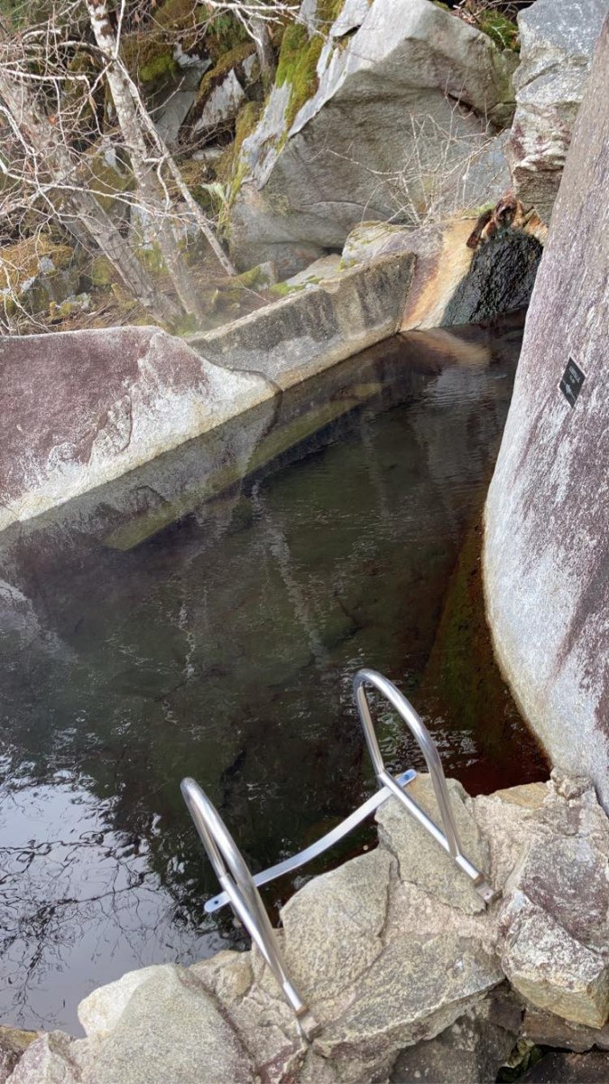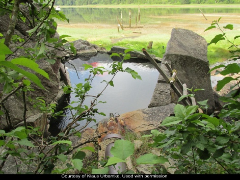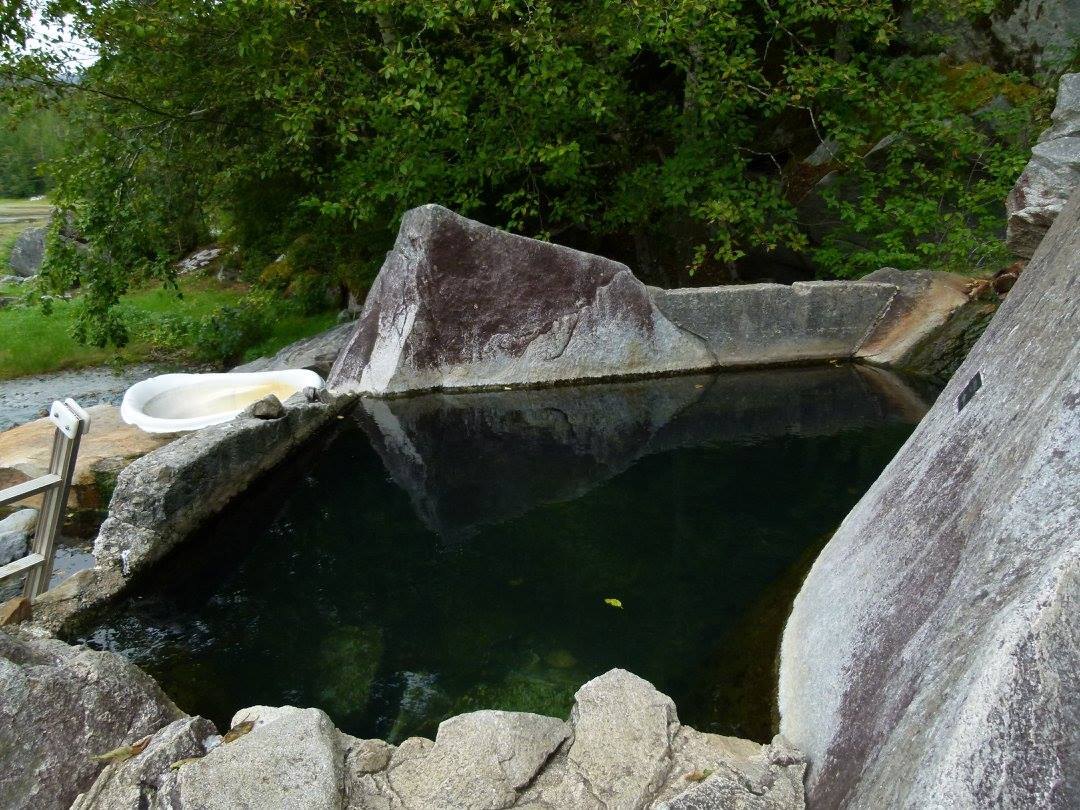 A pipe carries water into the main soaking pool, which has three large slab blocks forming the sides and concrete walls for the front and back. Usually, there is a ladder for access to and from the pools, and also maybe a plank bench for your clothes. Alge loves the water, so you may have to clean the pool if it hasn’t been used in a while. In summer, horseflies love the spot, detracting from your soaking experience. Fall, winter, and spring are your Best Bets for insect-free baths.