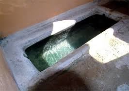 The house is a stone building made up of three small rooms with no doors or glass in the windows. The walls are stuccoed and more than a foot high, and the floor and shallow bathtubs are concrete. Hot, clear, odorless spring water drips into the tubs, maintaining an average temperature of 104 to 108 degrees F.