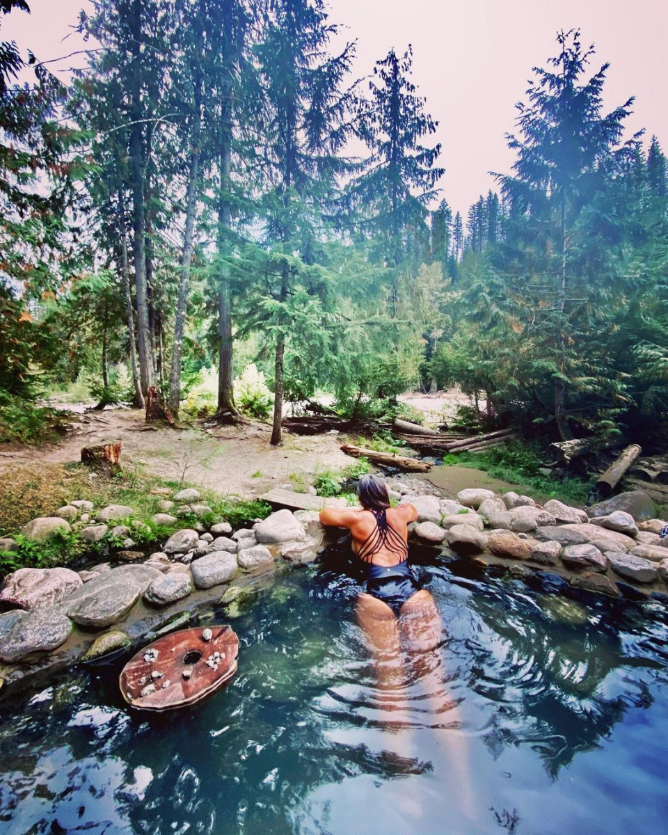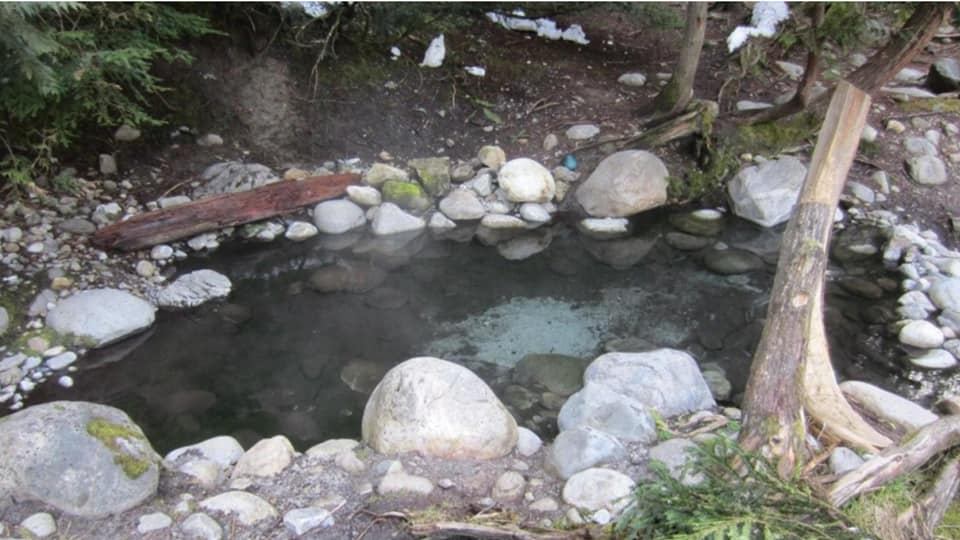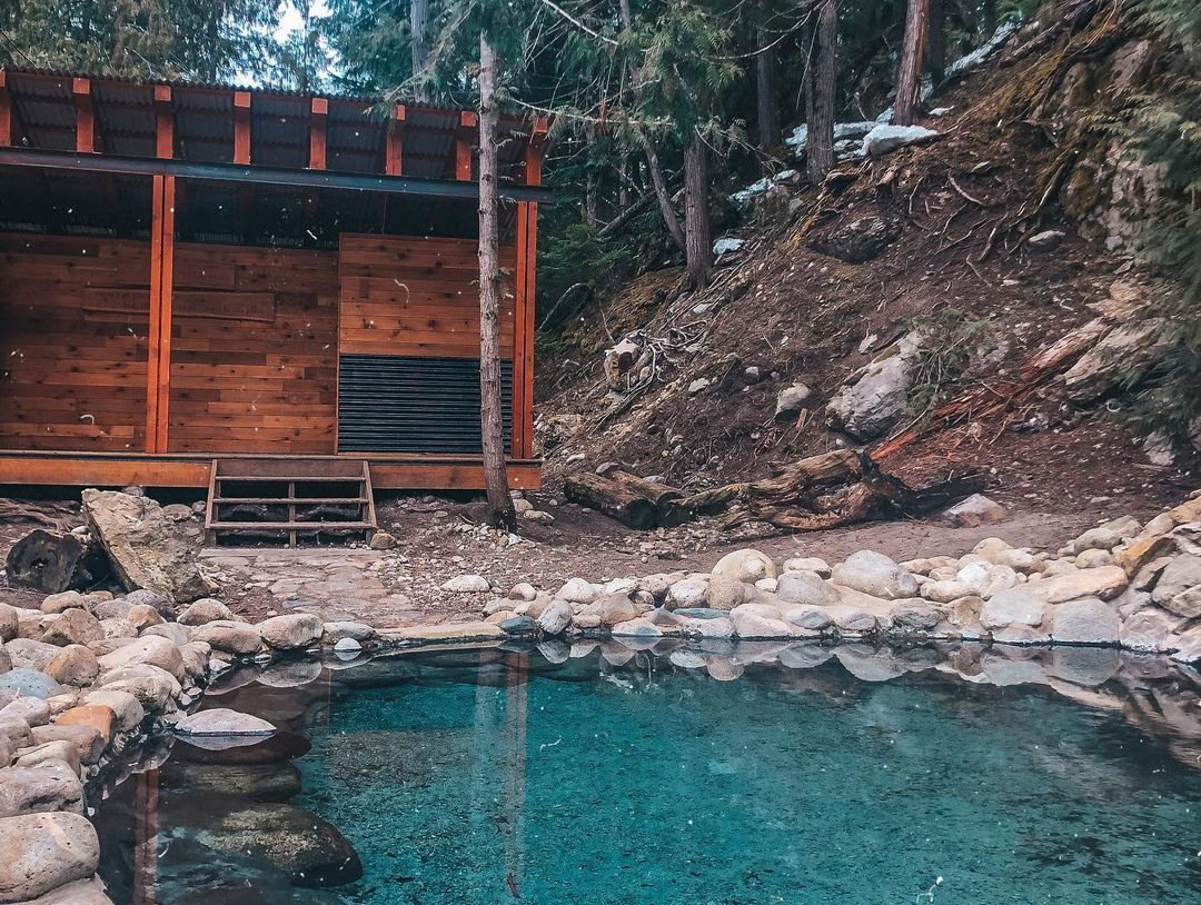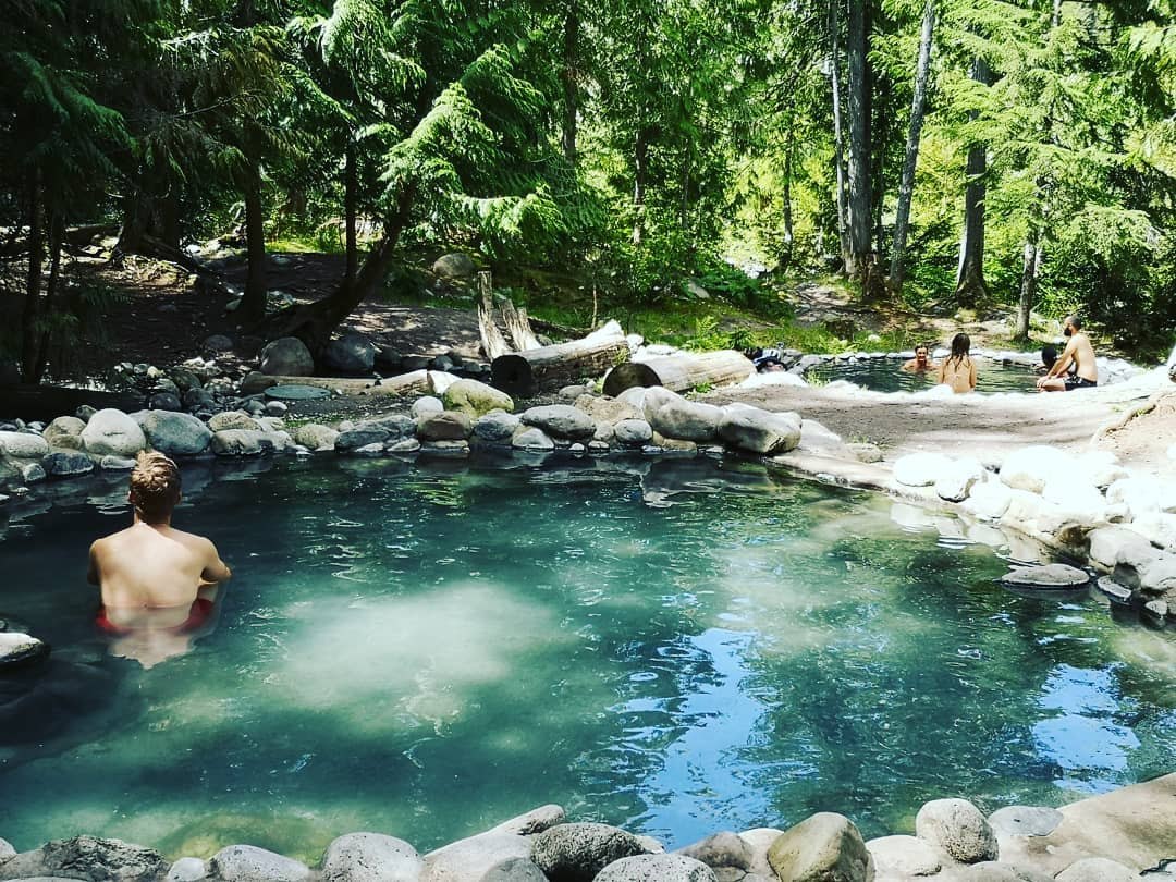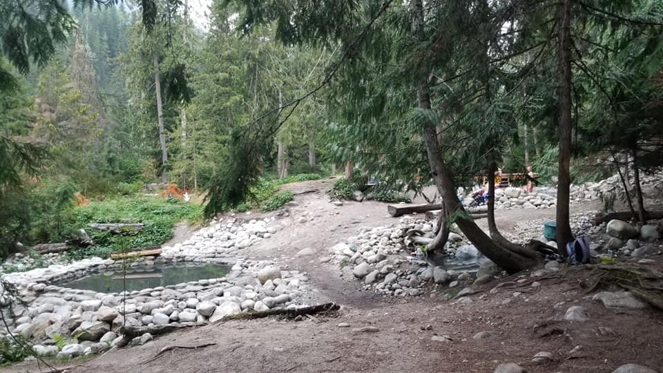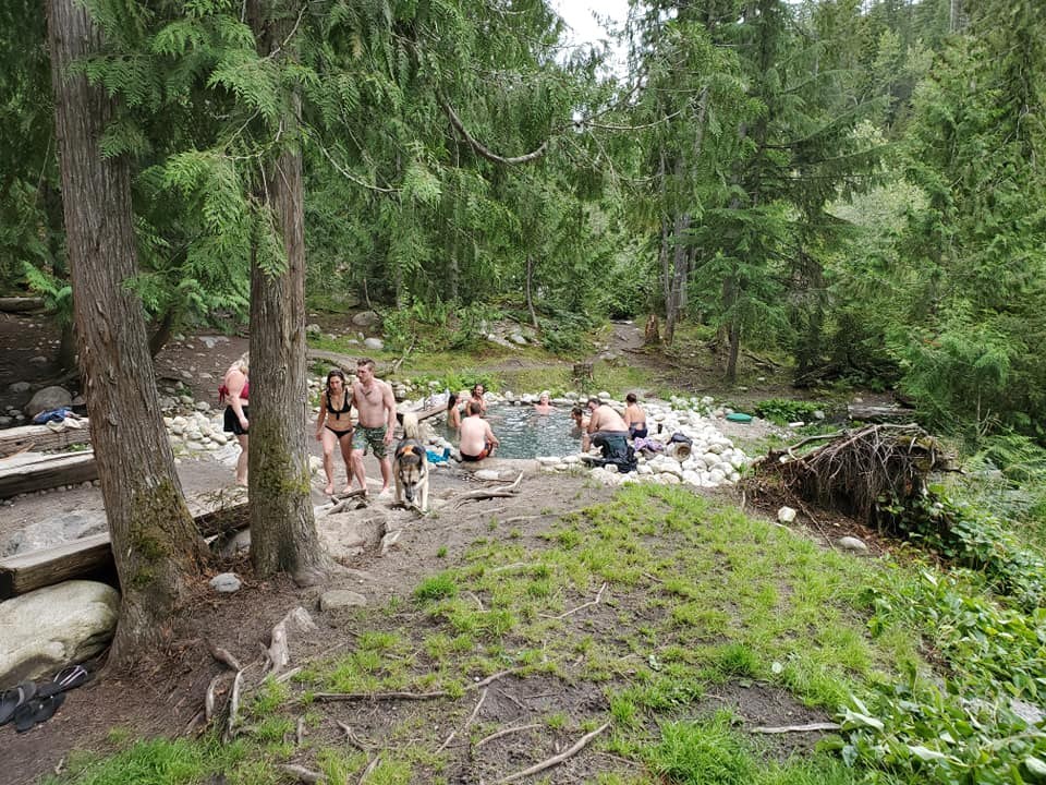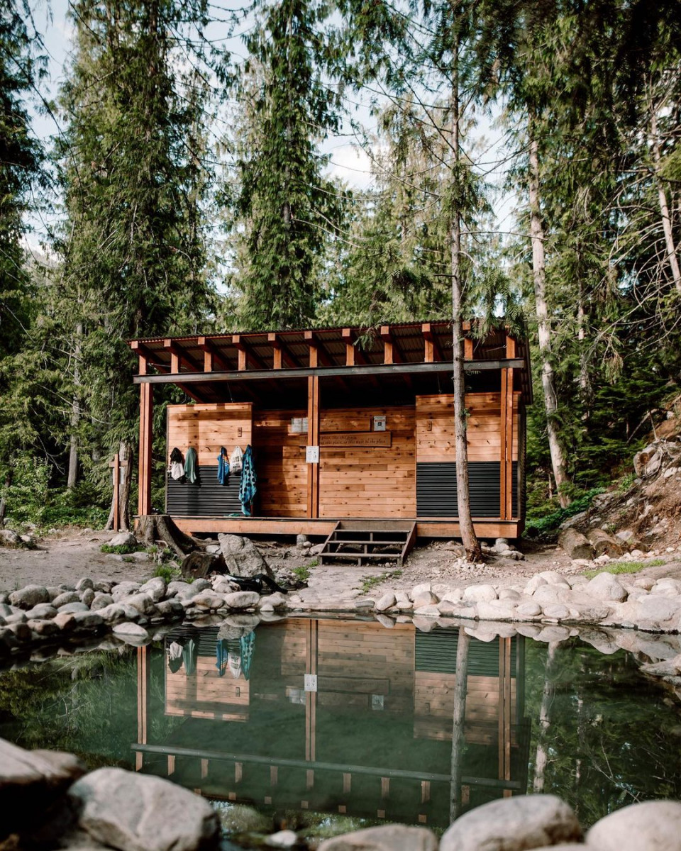 Once you get to the bottom, there’s a small change house where you can pop on your bathing suit and store your bag. Although these hot springs are natural, there is a small rec site camping area just foregoing the springs, so you likely won’t be alone. if you’re visiting between June and September