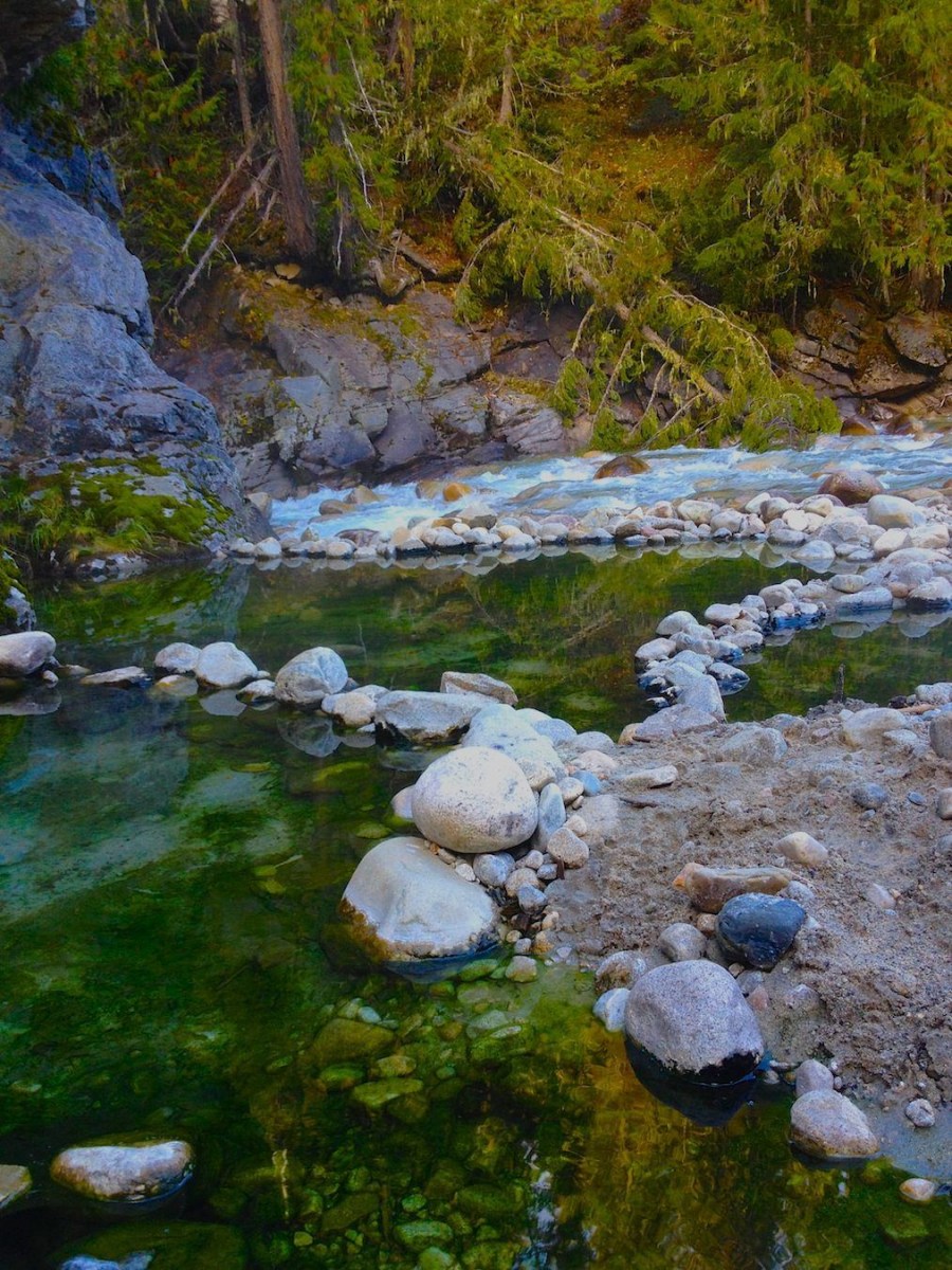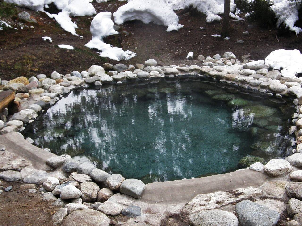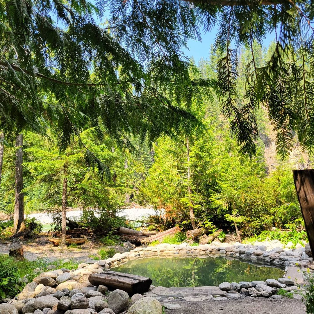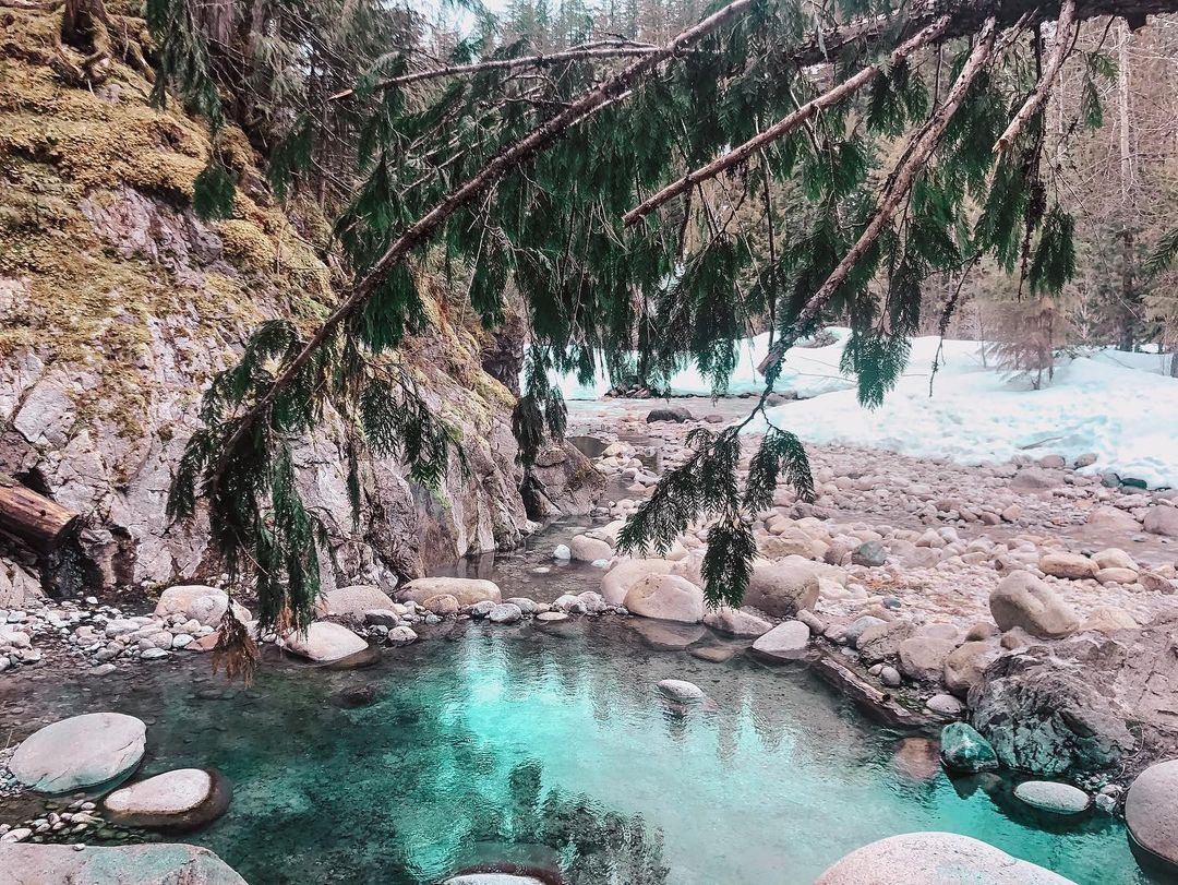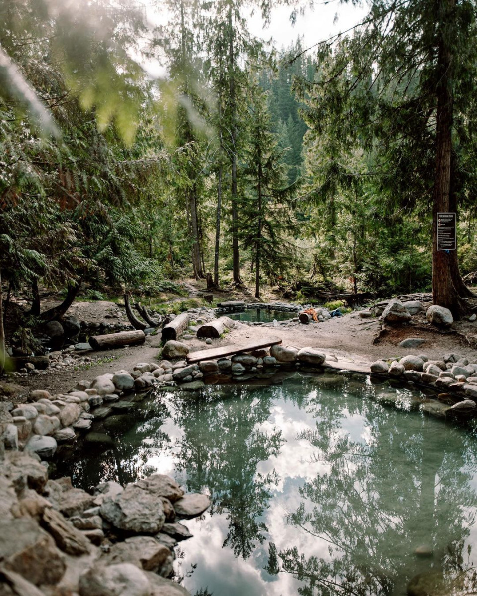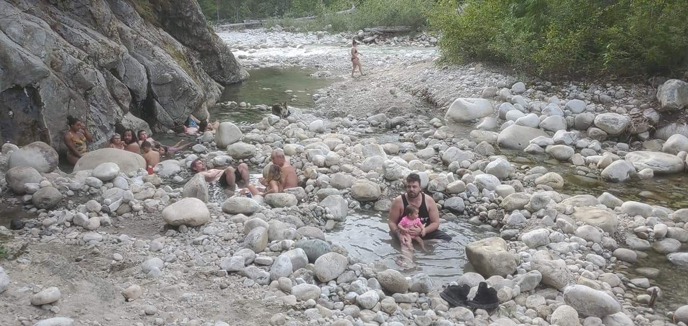 Once you get to the bottom, there’s a small change house where you can pop on your bathing suit and store your bag. Although these hot springs are natural, there is a small rec site camping area just foregoing the springs, so you likely won’t be alone. if you’re visiting between June and September