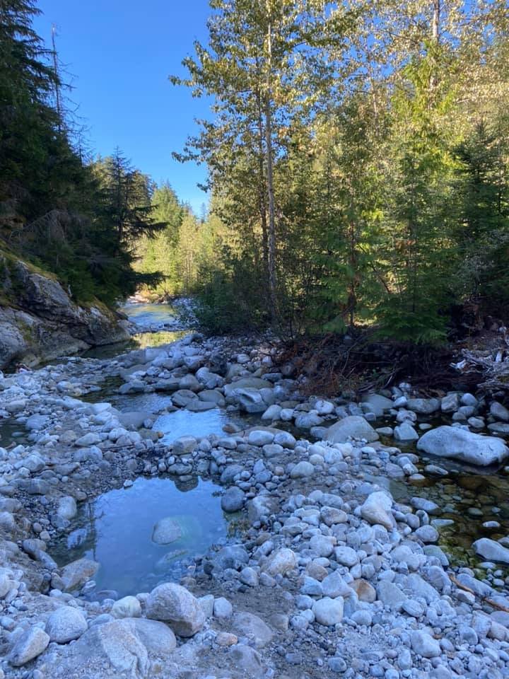 Keep an eye out for the halfway river as you continue driving. Moving across the bridge at Halfway River, slow down and take the first left on the FSR after the bridge.