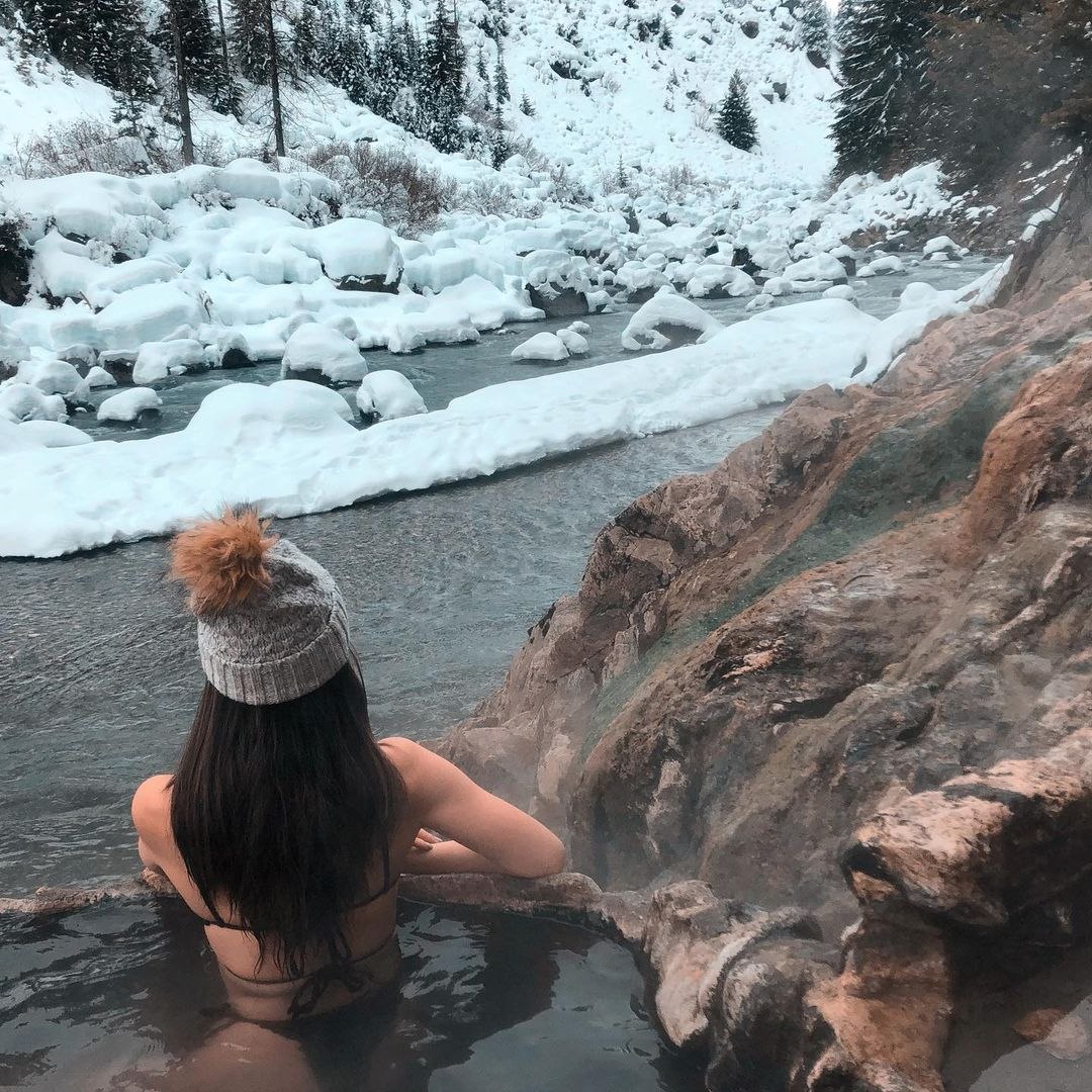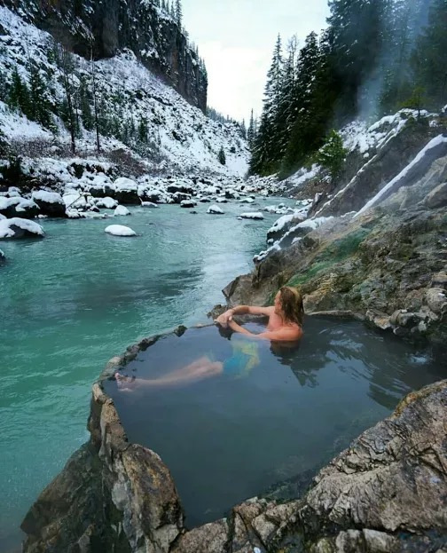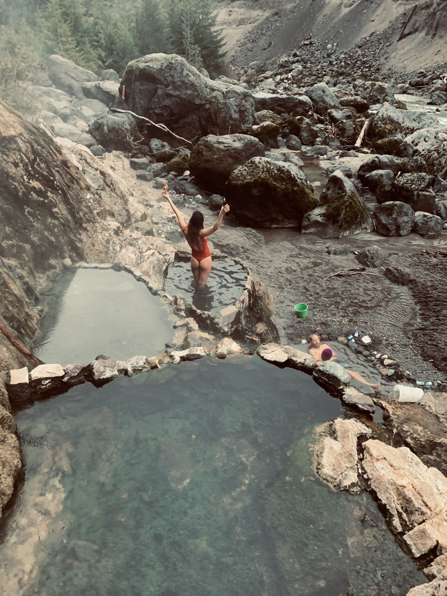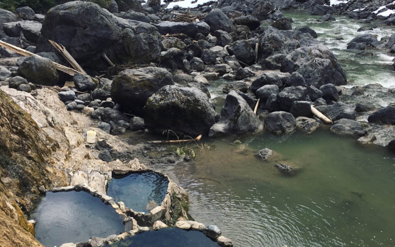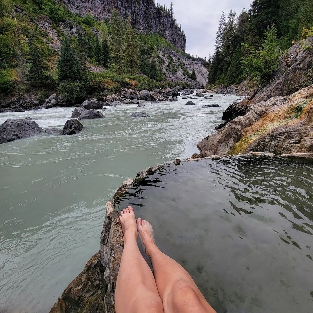 Sitting in the springs, you gaze out at the steep rock face and the vast, truck-sized blocks of it that lies in the river beside you.