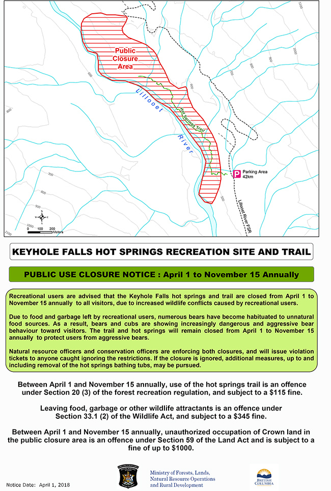 Keyhole Falls Hot Springs Rec Site and Trail are closed to all travelers from April 1st to November 15th each year due to heightened wildlife problems caused by recreational users. From November 16th to March 31st, it is accessible.