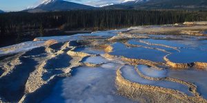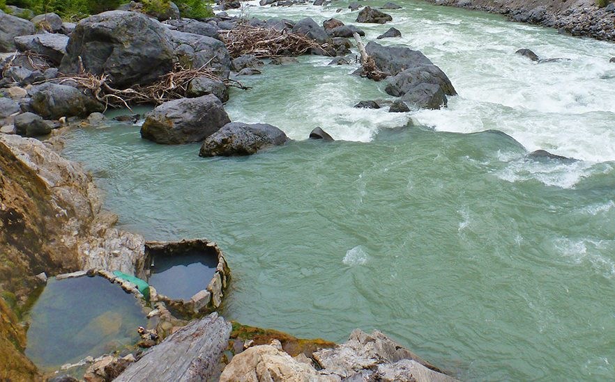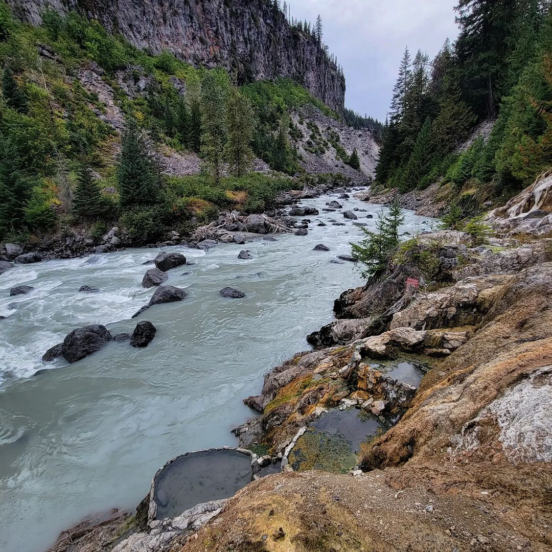 The hot springs at Keyhole emerge from the ground next to the Lillooet River’s swirling, roaring, and glacier-colored water. The color changes with the seasons, but it is always a wonderful, rich, milky turquoise. When sunshine penetrates the deep gorge, the milky turquoise transforms into an unnaturally bizarre emerald green that swirls all around you.