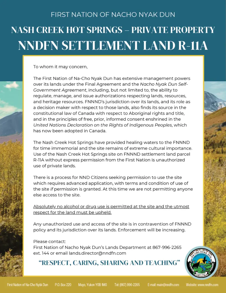 Access notice: The springs are on Na-Cho Nyäk Dun settlement land (parcel R-11A). In an official notice posted in March 2025, the Nation states that public access is not permitted at this time and that visiting without permission is unauthorized. (Link the PDF directly on your page so people can read the full notice and see the contact info.)