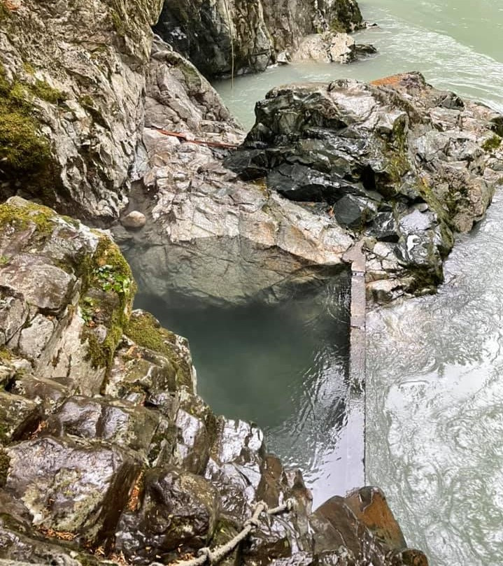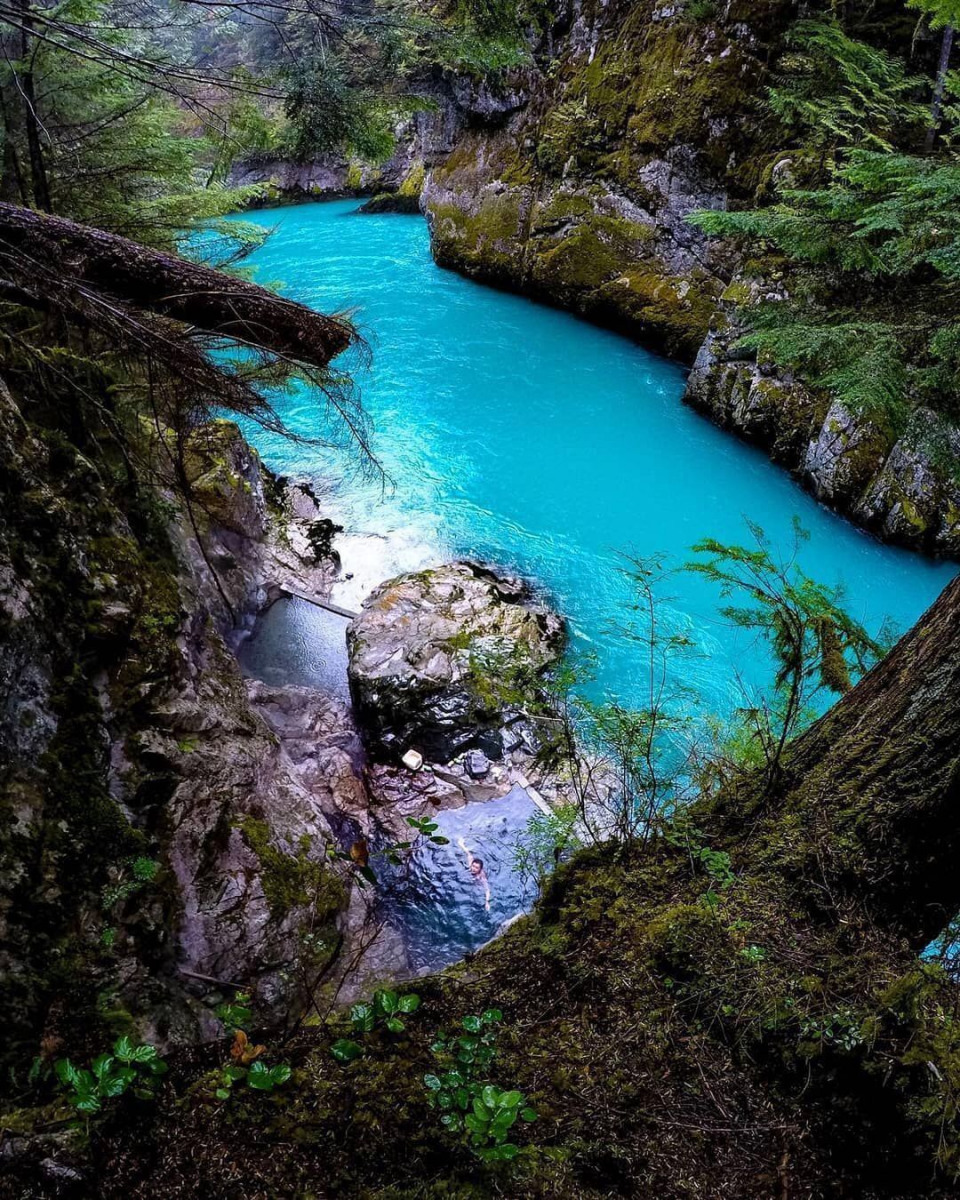 Down in the gorge, you’ll find a natural hot spring beside the roaring river. No tubs. No decks. Just rock, water, and wilderness. There’s no cell signal. No help coming. Soak it in—literally—but be smart.
