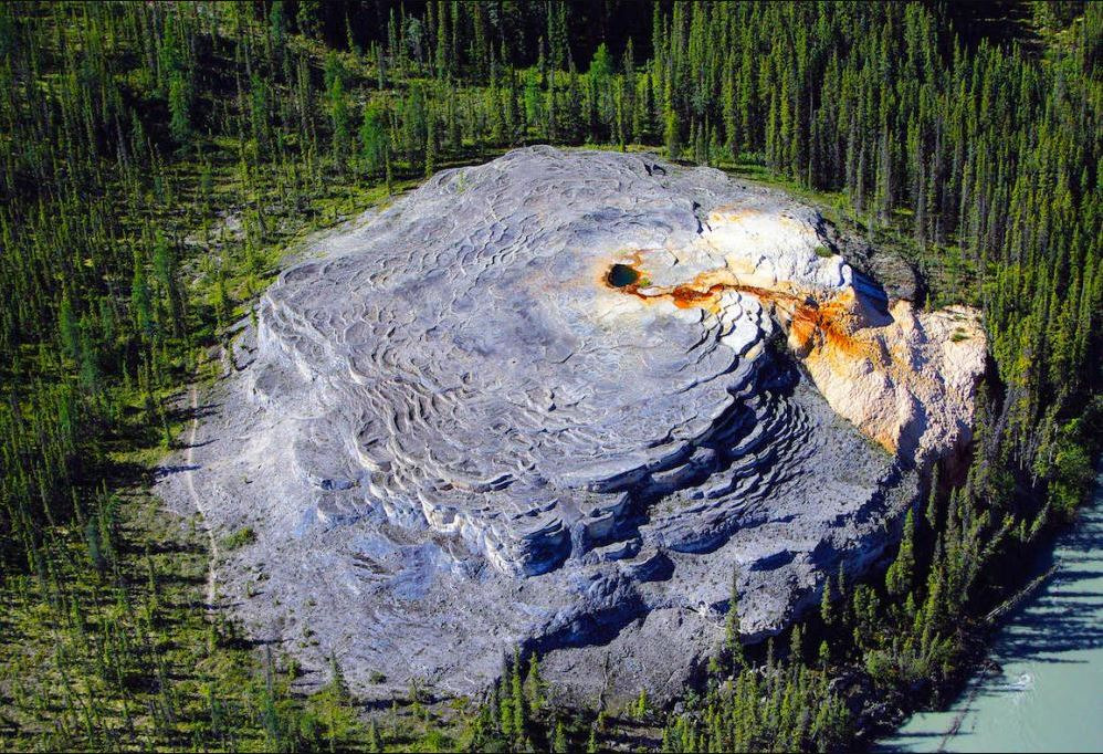 The South Mound has grown into an adjacent slope and is now only about half as tall as the North Mound. They are the world’s only tufa mounds known to be situated atop permafrost. The mounds are layered and multicoloured.