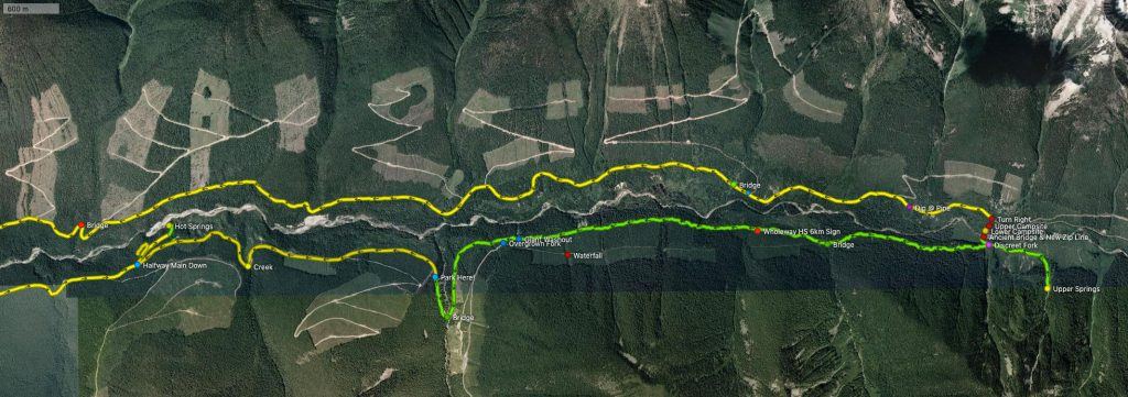 This alternate approach also begins from the road to Halfway Hot Springs. Reset your odometer at the BC Parks sign and continue for 1.5 km past a noticeable creek turn.