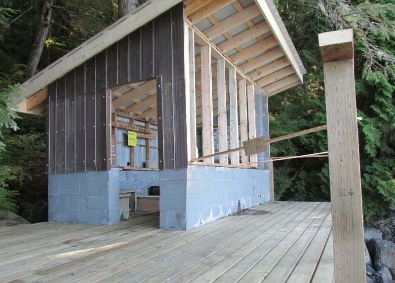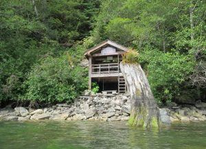 The mainspring is on a steep slope about 20 m above the high-tide line. Hot water and Bubbles from a crack in the bedrock. The water is odorless, tasteless, and has a moderate content of minerals, sulphate, and sodium during periods of heavy rain. The temperature this spring is noticeably lower than in dry periods. Water is piped down to a small cement block bathhouse on the shore; it has a low ceiling and feels a bit like a bunker. Once you ease into the bathtub, the water is great! Like Bishop Bay, the Springs are popular with boaters and fisherman From Kitimat. It can be very crowded on weekends in the fishing season. There’s a nice area here for camping.