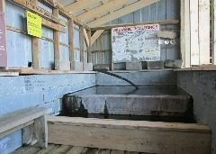 A bathhouse is available for park visitors to soak in the hot springs water. The hot springs water flows out of the ground on the hillside above the bathhouse at a rate of about 11.8 litres per minute. The temperature of the water at the source is approximately 44.7 degrees Celsius, while the temperature in the bathhouse is approximately 38.6 degrees Celsius. The water from the hot springs is not fit to drink.